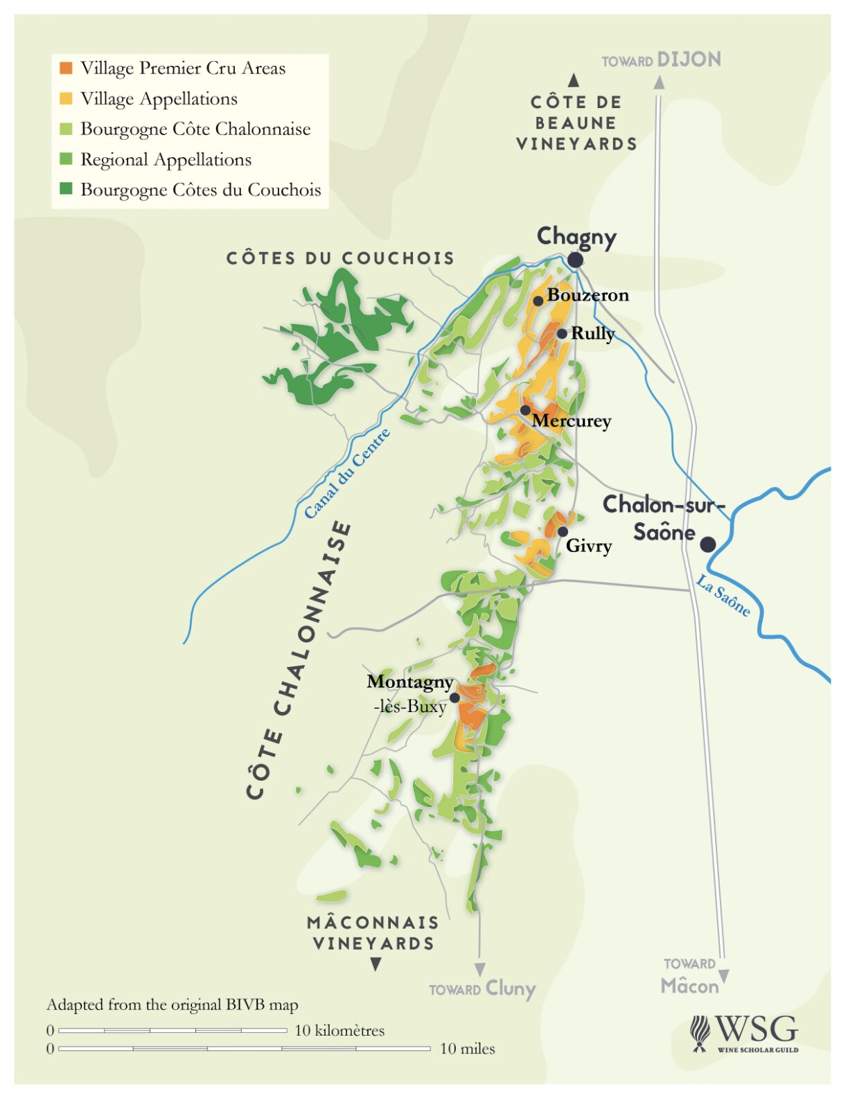 This map presents the Côte Chalonnaise vineyards of the Bourgogne wine region, detailing village and Premier Cru sites. It provides a geographic reference for the area's winemaking areas, including the locations of main cities and appellations. The map is crafted to be used alongside the French Wine Scholar® program, the industry's respected authority on French wine.
