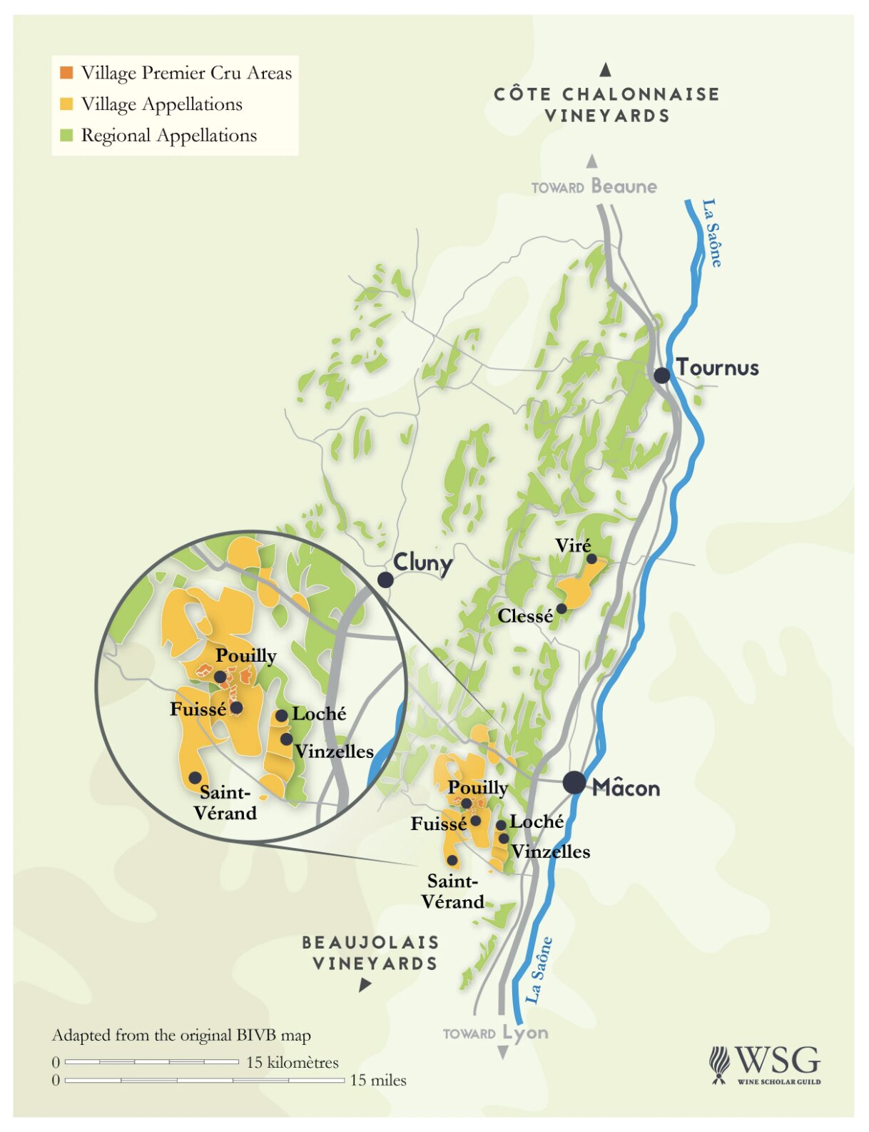 This map presents the distinguished vineyards of the Mâconnais region in Bourgogne, France, renowned for their exquisite wine production. It details the geographic layout of towns and specific vineyard locations, serving as an educational tool for wine enthusiasts and industry professionals alike. The map has been designed to accompany the industry-renowned French Wine Scholar® program, providing detailed visual context to the intricate world of French viticulture.
