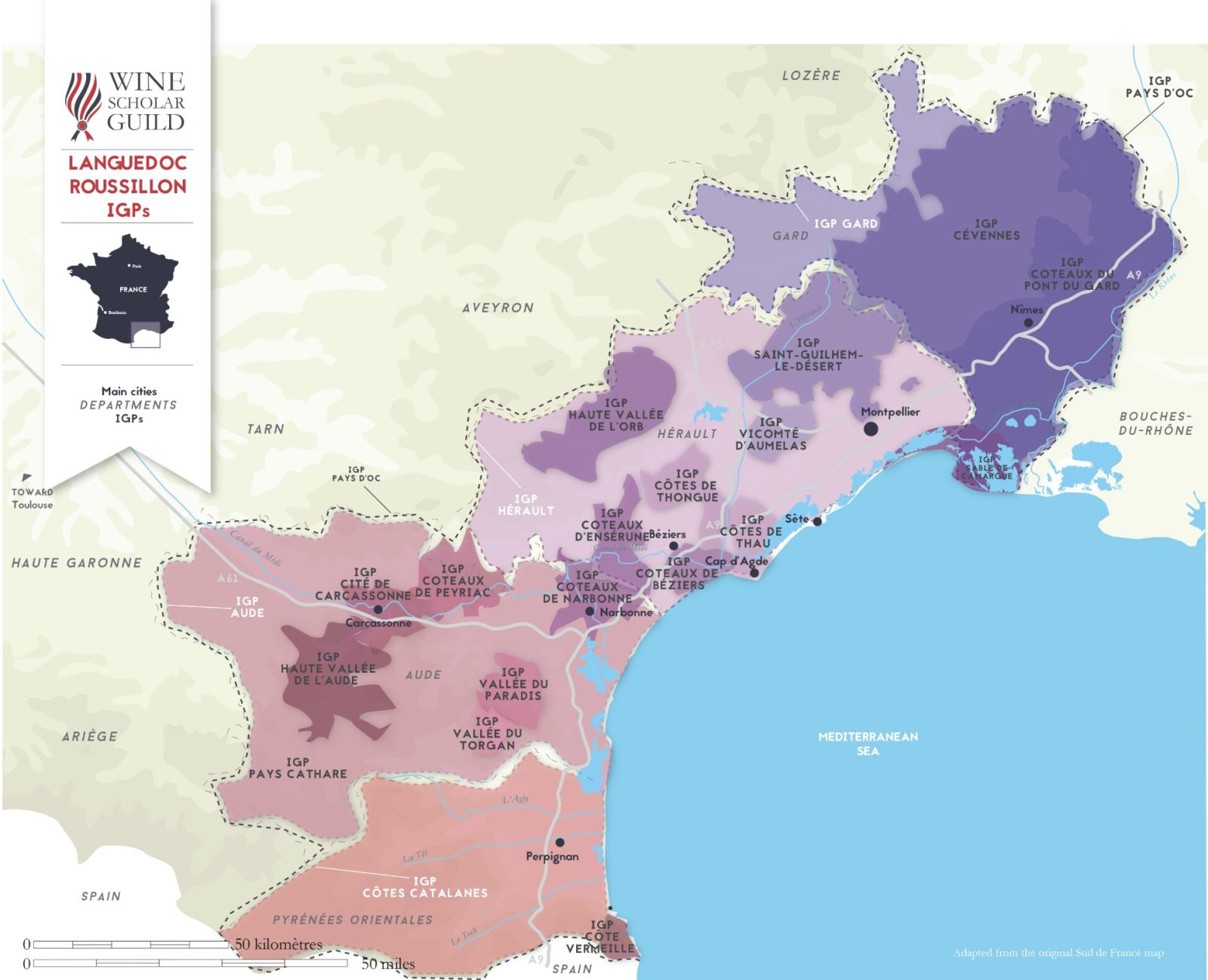 This map presents the Indication Géographique Protégée (IGP) regions of the Languedoc-Roussillon wine-producing area in France, detailing the distinct zones where various appellations produce unique varietals. The color-coded regions highlight the geographical diversity, from coastal plains to inland valleys, reflecting the range of microclimates that contribute to the area's rich viticultural heritage. This map is specifically designed to complement the French Wine Scholar® program, a globally recognized course of study that delves into the intricacies of French wine.