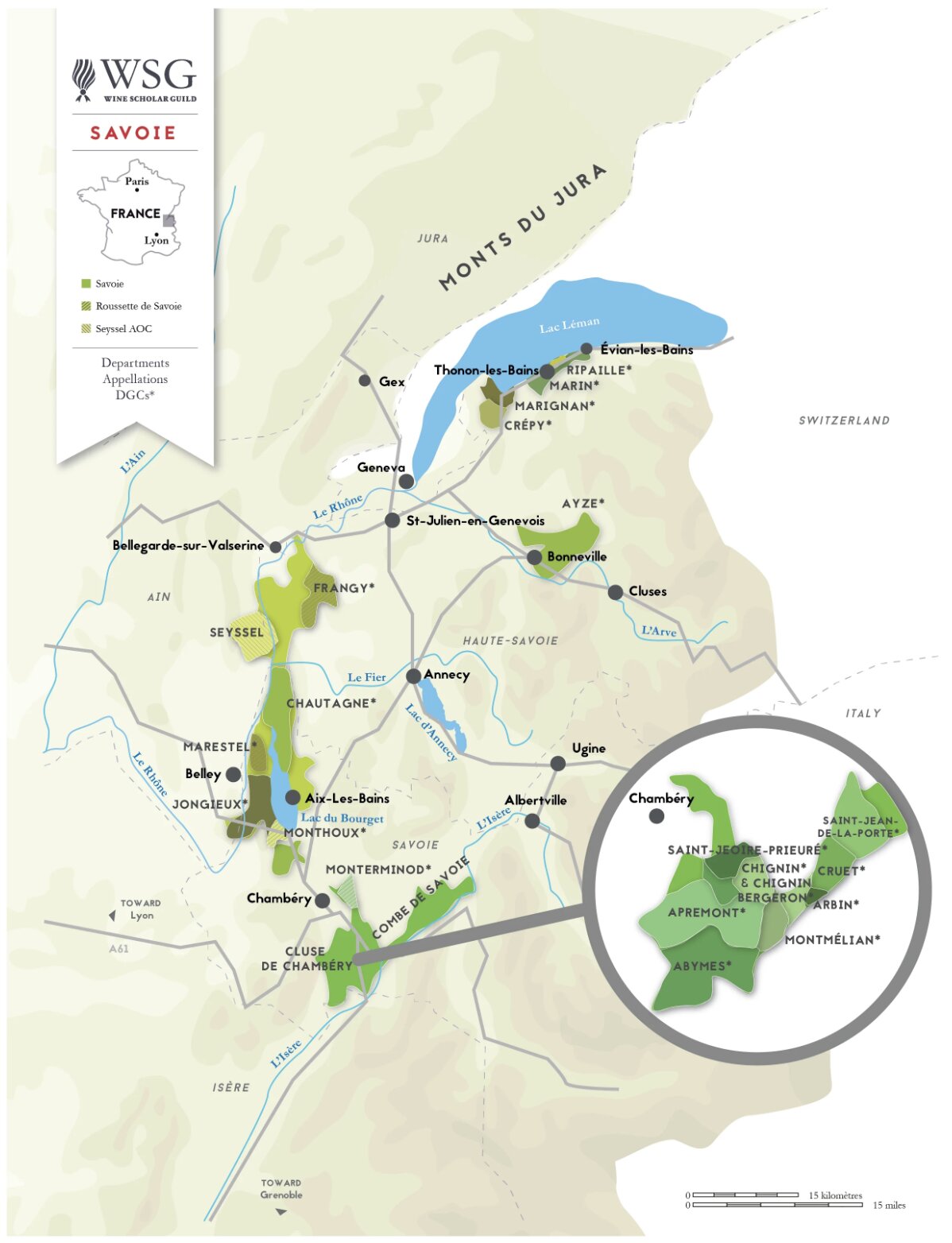 This map presents a detailed overview of the Savoie wine region in France, highlighting the key areas of wine production, including the designated Appellation d'Origine Contrôlée (AOC) zones such as Savoie AOC, Roussette de Savoie AOC, and Seyssel AOC. It also marks the main cities and notable wine appellations within the departments, providing a geographical context for the renowned vineyards that contribute to the region's viticultural heritage. Designed to complement the esteemed French Wine Scholar® program, this map serves as an educational tool for those looking to deepen their understanding of French wine.