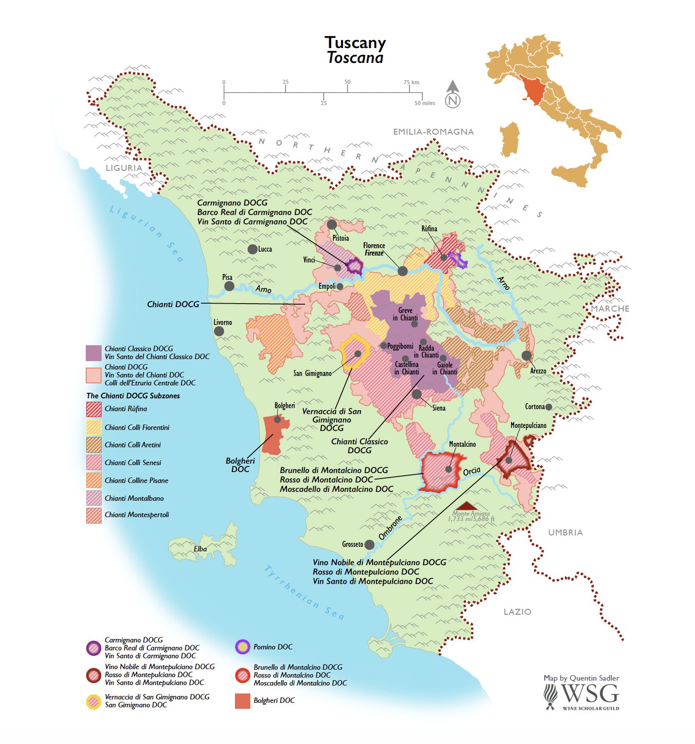 Tuscany, a crown jewel of Italian viticulture, is revered for its rolling hills, sun-drenched vineyards, and the iconic Sangiovese grape. Its diverse subzones yield wines of elegance, power, and unmistakable identity, reflecting a balance of tradition and innovation. The map has been designed to accompany the Italian Wine Scholar® program, a benchmark of excellence in the wine industry.